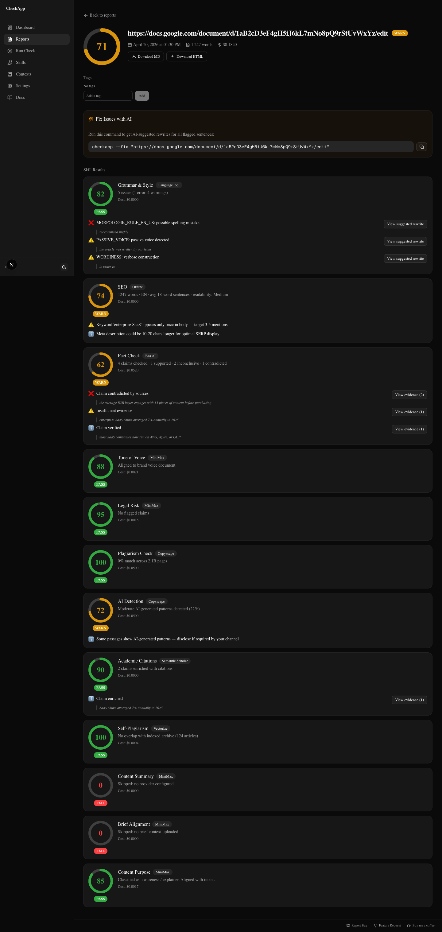 If you want to add it to a CI pipeline or run checks headless across a batch of files, the CLI handles that too: checkapp article.md --ci exits nonzero on fail. One mention because it's there — but for most agency editors, the dashboard is the right interface.